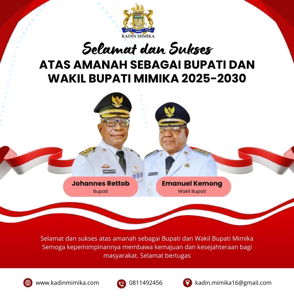 Kamar Dagang & Industri (KADIN) Kabupaten Mimika mengucapkan puji syukur dan selamat kepada Bapak Johannes Rettob sebagai Bupati Mimika dan Bapak Emanuel Kemong sebagai Wakil Bupati Mimika yang baru dilantik untuk masa jabatan 2025-2030. Pelantikan ini tentunya menjadi momen penting bagi seluruh masyarakat Mimika, terutama bagi para pelaku usaha yang berharap akan adanya perubahan yang positif dalam pengelolaan pemerintahan dan tata kelola bisnis di daerah ini.